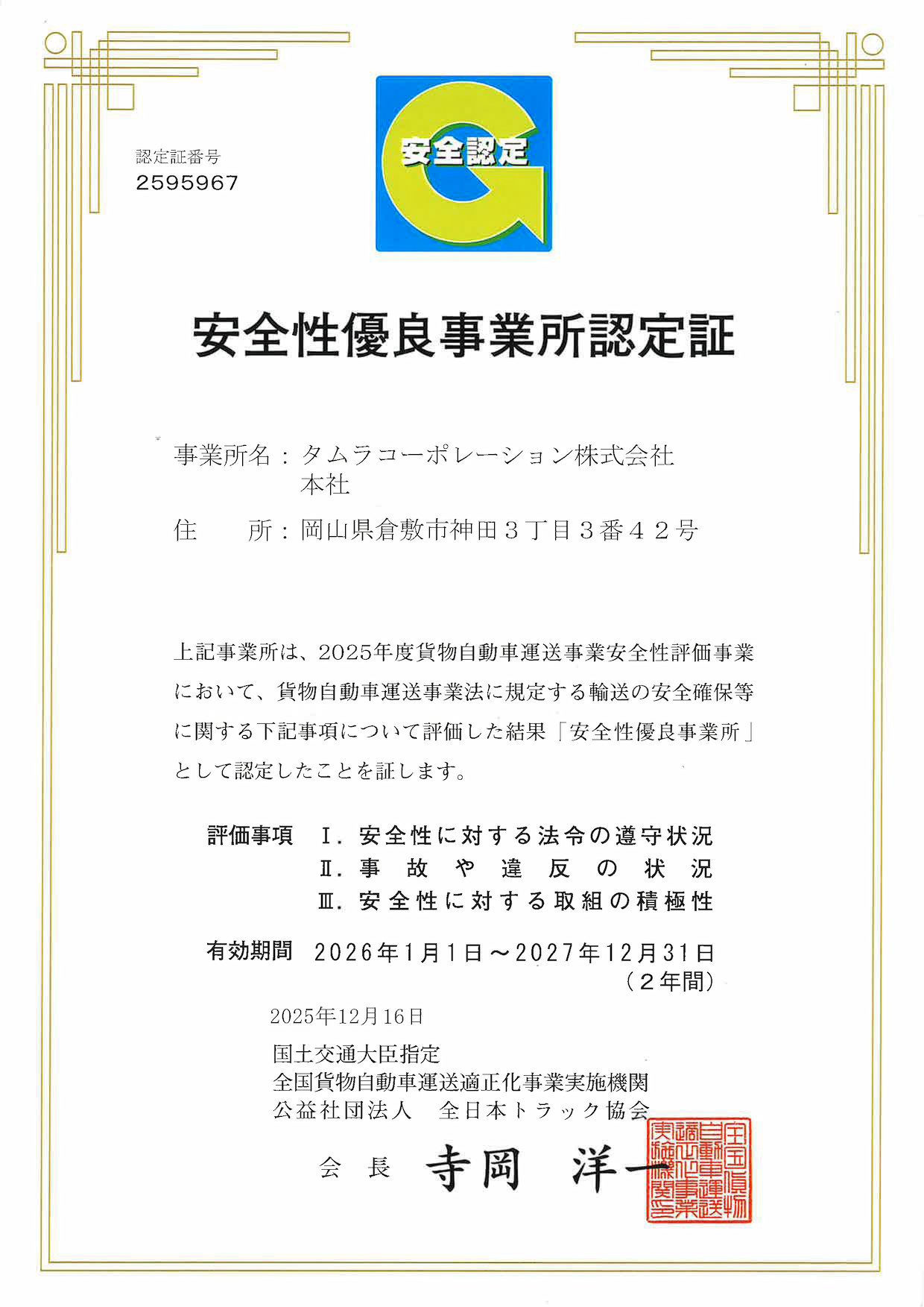 令和7年12月16日 国土交通省推進の安全性優良事業者認定(Gマーク)を取得いたしました。